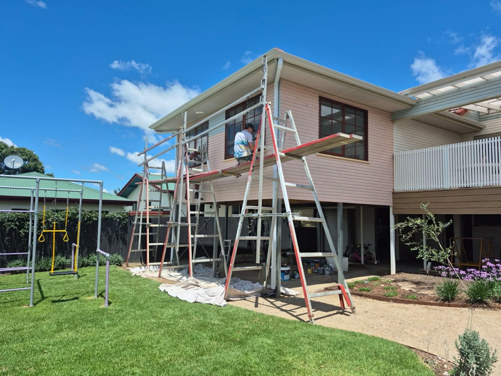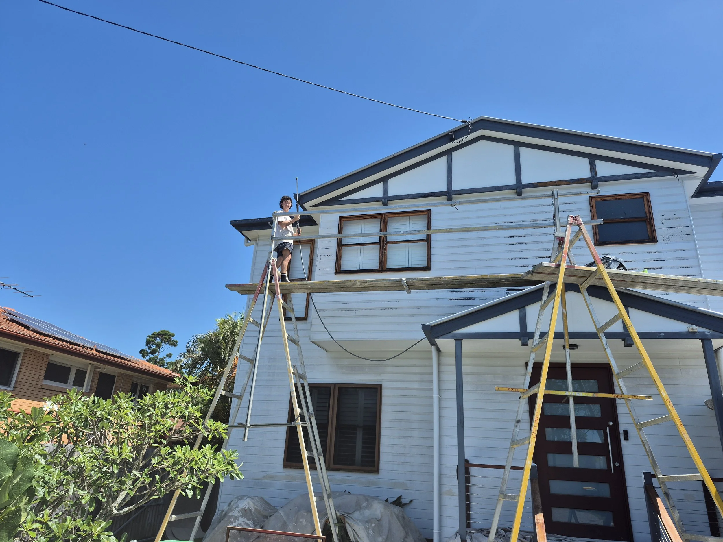 BUFO Paint takes job-site safety seriously, which is why we use aluminium A-frame trestles and planks fitted with full safety handrail systems whenever we paint multi-storey homes. This lightweight, secure setup gives our painters stable access to upper levels and rooflines while reducing fall risks in line with Australian WHS expectations and recognised industry standards (AS/NZS 1576 and AS/NZS 1892). We also utilise mobile scaffold towers where suitable, and for larger or more complex projects we engage licensed scaffold companies to design and erect compliant scaffolding systems. To keep our temporary access equipment modern, well-maintained, and fully compliant, we hire from trusted local scaffold and equipment hire providers. In addition, our team members hold current EWP licences, enabling safe operation of scissor lifts and boom lifts when mechanical access is required. The result is a safe, efficient, and professional jobsite that protects our team and ensures a high-quality finish for our customers.